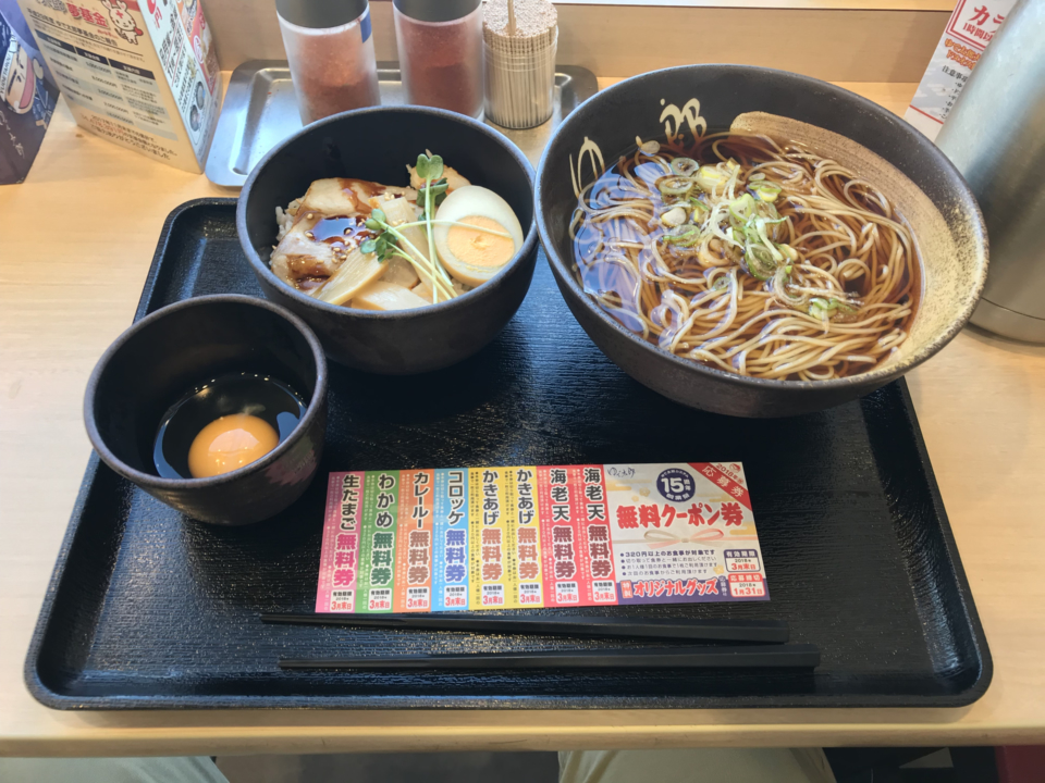 この日食べたのは○得セットでした。あったかいお蕎麦とチャーシュー丼のセットに、クーポンで生卵をつけました。あーおいしかった!